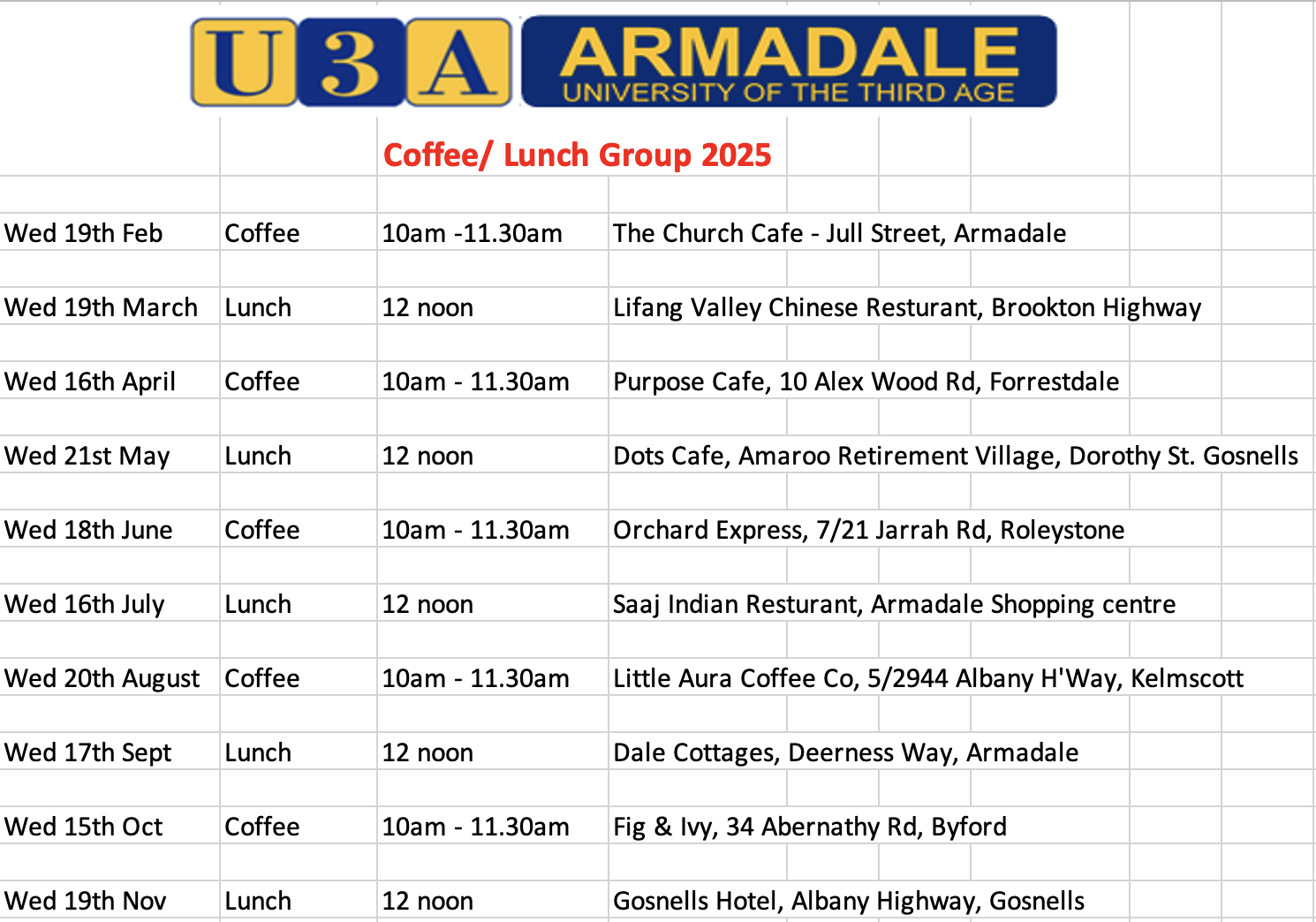 Third Wednesday of each month: Feb to Nov.All the venues are subject to change.Any problems please contact Sheila: 0439 926 333 or Denise: 0414 779 115.