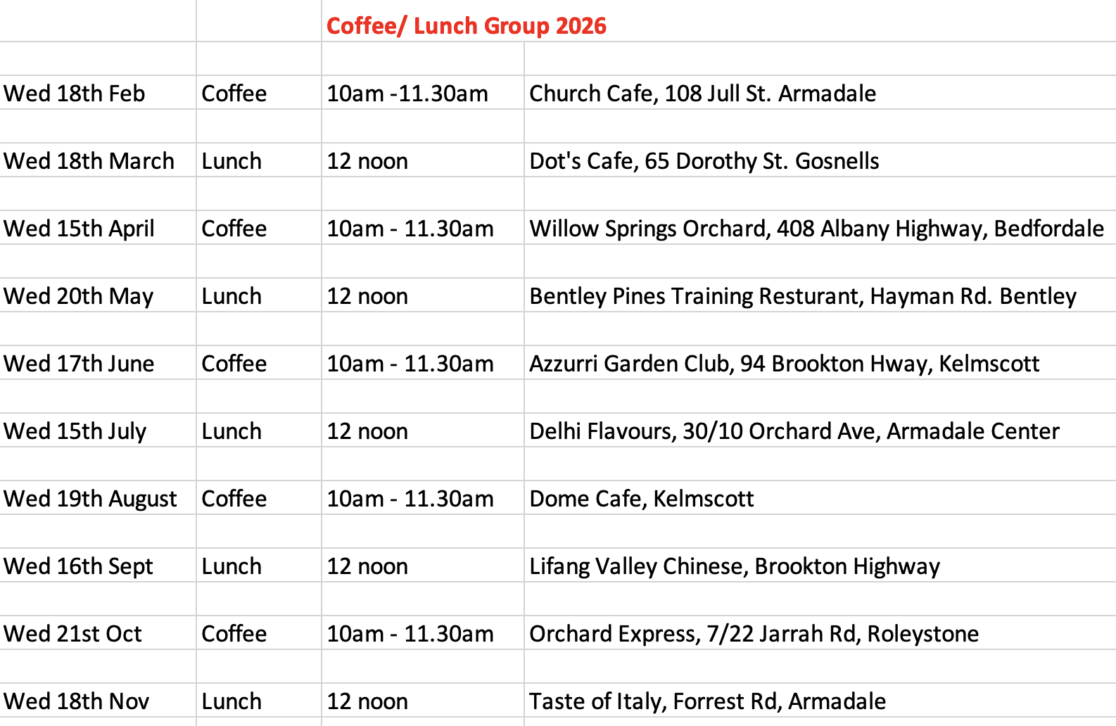 Third Wednesday of each month: Feb to Nov.All the venues are subject to change.Any problems please contact Sheila: 0439 926 333 or Denise: 0414 779 115.